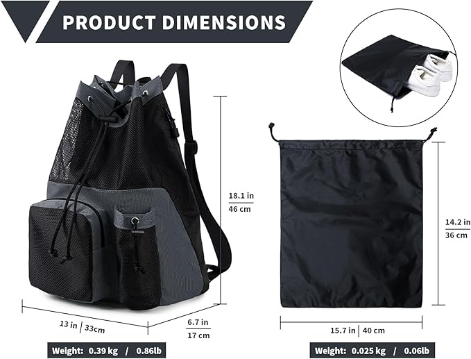 - [Large Space] - Size: 13 X 6.7X 18.1 inch, It's perfect for storing and organizing all your fitness equipment and change of clothes. Large capacity mesh backpack Design Keeps sand and water away for quick drying, allows you to find what you need quickly, such as toys, beach towels, shoes, swimsuits, sunglasses, goggles, snacks and etc.