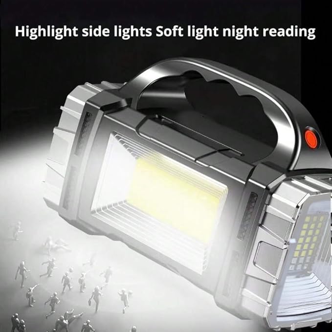 - 2 heads Main Lights&1 Side Light. LED flashlights handheld spotlight is equipped with high-brightness led wick, support front(red/blue strobe light for emergency) and back main light side light. You can change the light source to suit your needs, making your outdoor activities more efficient and comfortable.With upgraded large-capacity battery,charging for 2 hours supports 5-9 hours of work.
