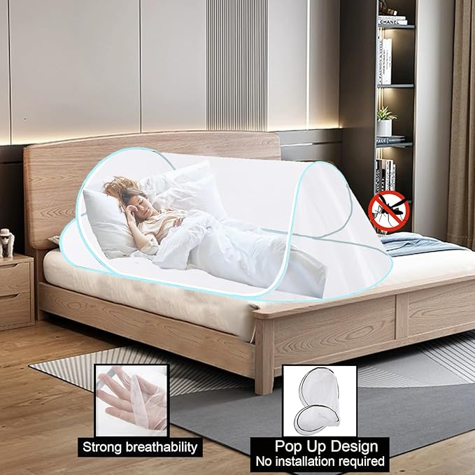 - No installation, ready to use: Pop-up mosquito nets are very easy to install because they pop into place when you take them out of the bag. Also, You just need 6 steps to fold and stored as a circle with a diameter of approximately 13.38 inch(34 cm)