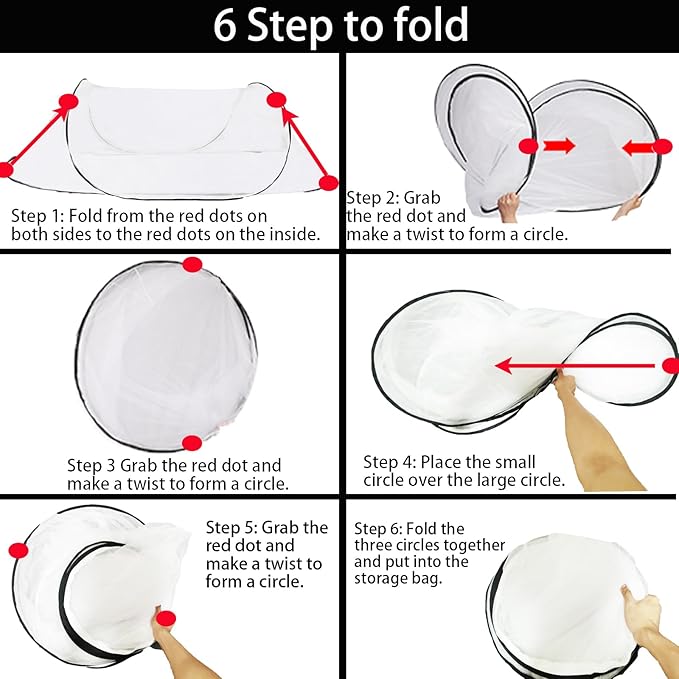 • No installation, ready to use: Pop-up mosquito nets are very easy to install because they pop into place when you take them out of the bag. Also, You just need 6 steps to fold and stored as a circle with a diameter of approximately 13.38 inch(34 cm)