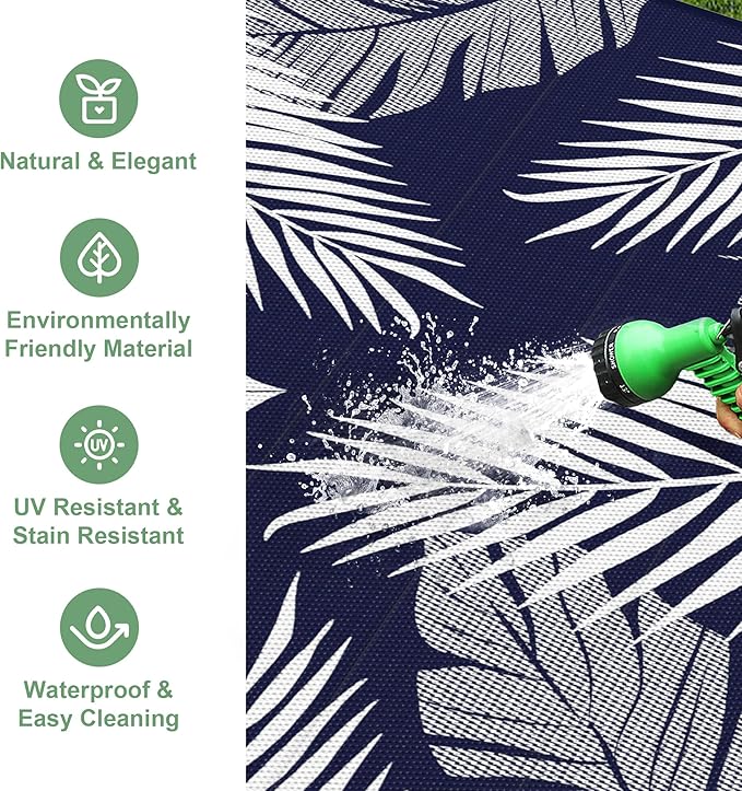 - 【WATERPROOF & EASY TO CLEAN】Our indoor outdoor rugs are designed to be waterproof, stain-resistant, non-slip, easy to clean, and highly breathable. Outdoor patio rug perfect for picnics, you can relax without worrying about drink spills, food stains, sand, or dirt. Simply rinse with water or wipe with a damp cloth for easy cleaning. The breathable material enables the waterproof rug to air dry swiftly, allowing you to enjoy leisure time outdoors or indoors with your family and friends