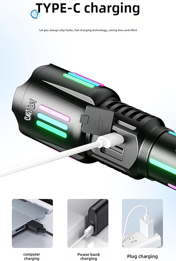 - 【POWERFUL BATTERY & USB RECHARGEABLE Flashlight】Built-in fast charging chip, twice as fast as the charging speed of ordinary USB Flashlight rechargeable. This high-power Flashlight can work about 8-20 hours on a single charge. With circuit protection, such as overcharge protection, over-discharge protection, over-voltage protection, short-circuit protection, etc., which can extend the life of the Flashlight high lumens rechargeable up to 2000000 times.