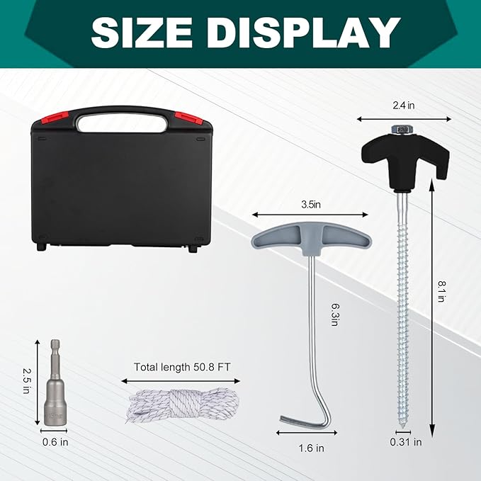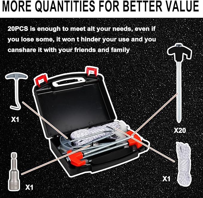 - ACCESSORIES: easy to store and sturdy carrying case, 13mm hex bit, tent stakes nail puller, 50FT tent rope.