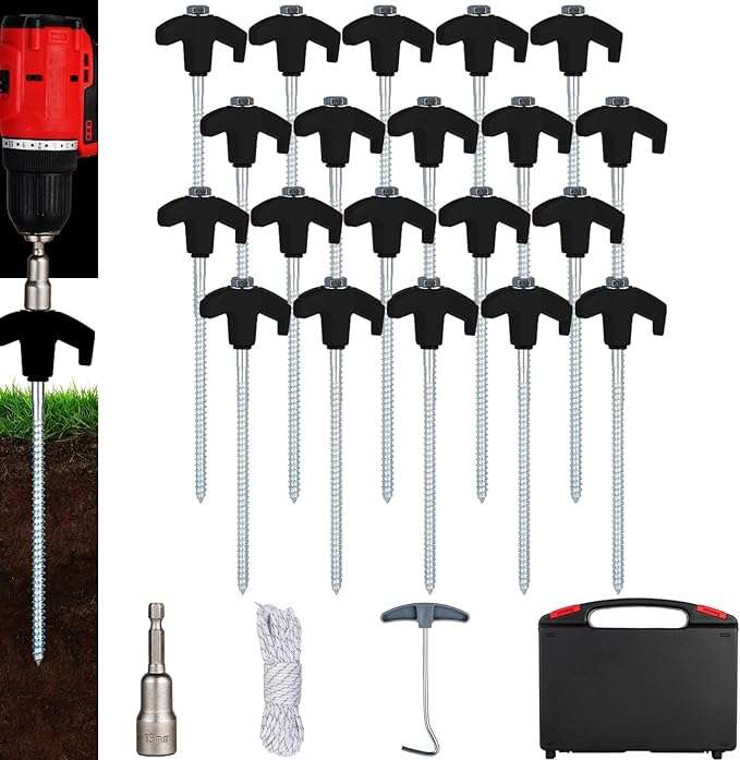 20PCS Screw in Tent Stakes Heavy Duty,8 Inch Screw in Tent Pegs,Metal Camping Stakes,with Hex Head Driver,Nail Lifter,Ropes,Camping Tent Accessories,Black