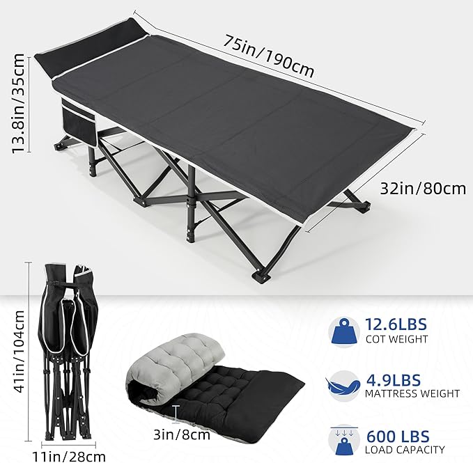 - Heavy Duty Camping Cot: HABUTWAY camping cot is made of high-quality carbon steel. The X-shaped structural frame and 10 non-slip support legs ensure the stability of the camp cot.600LBS weight capacity, it's sturdy enough to hold the weight of most adults, an ideal sleeping cot for adults.