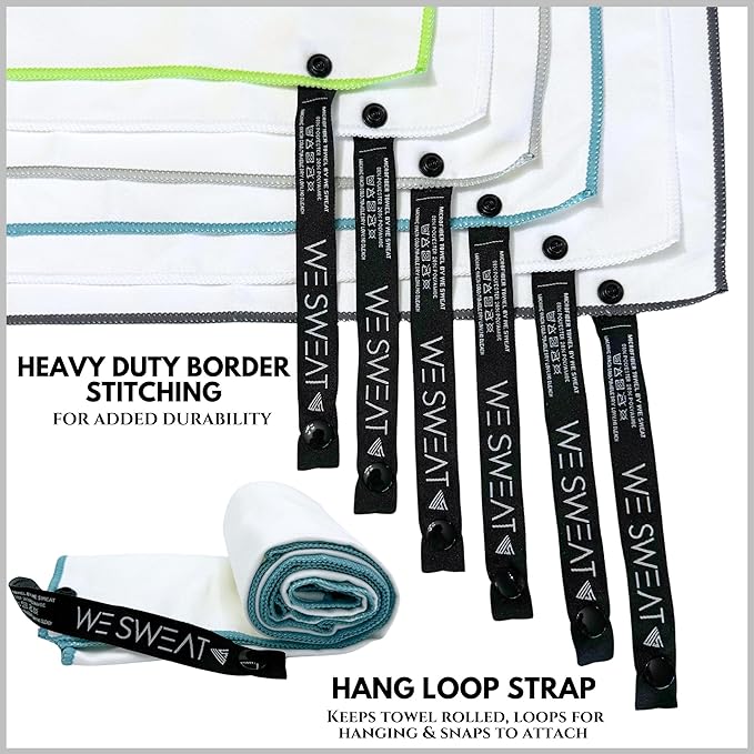 - Hang Loop Snap Strap – WE SWEAT’s microfiber towels are perfect for any activity, with the added convenience of a strap that snaps. The snap strap closure allows you to have your towel attach to a workout machine, your arm, backpack, or even your belt loop. WE SWEAT’s microfiber towel for body are convienant when exercising whether hanging, or having it snapped and rolled up into a packable travel-friendly size.