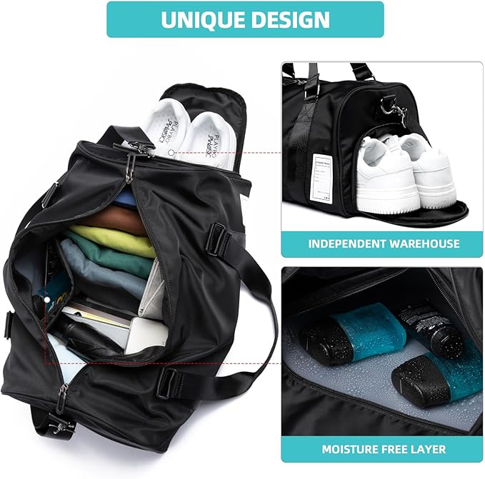 - [LARGE CAPACITY GYM BAG]Multiple pockets ensure that you can place all your belongings when you are out and about. Large main pocket can put down clothes, headphones, camera.Inside categorized pockets can put your cell phone, mobile power. Inside zippered wet/dry pocket can put toiletries. There is a separate shoe compartment to prevent shoe stains and water stains from contaminating your clothes. It is a great choice for fitness, outdoor and traveling.