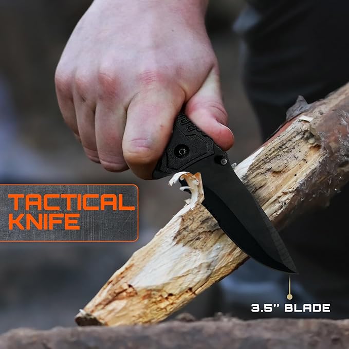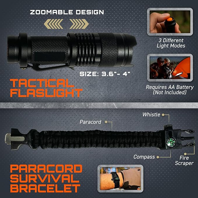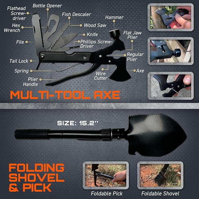 - SURVIVAL GEAR WITH FISHING TOOLS: The kit features crucial survival tools like a 15-in-1 multi-tool axe, a 2-in-1 folding shovel and pick, a tactical flashlight, a fire starter kit, and more—even fishing gear. Don’t just survive—catch your next meal.