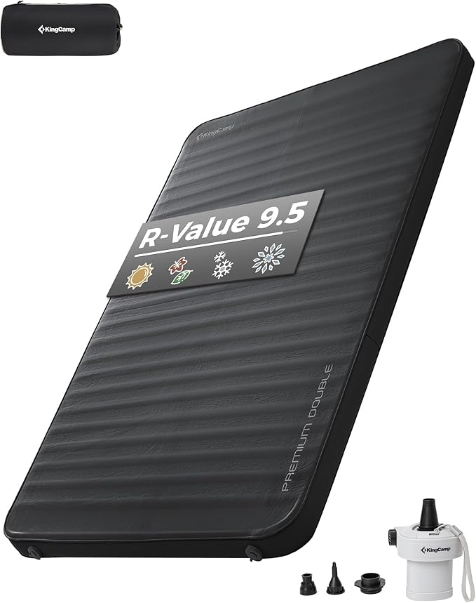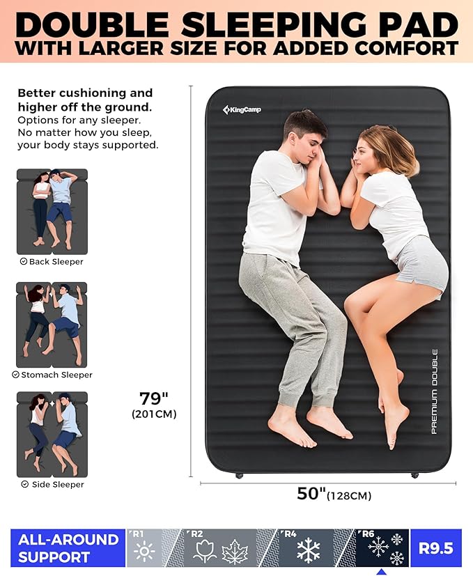 KingCamp Double Sleeping Pad, 2 Person Queen R 7.9 Self Inflating Sleeping Pad, 3" Thick Full Size Foam Mattress Mat with Air Pump for Outdoor Camping Tent Car, PVC Free (Black)