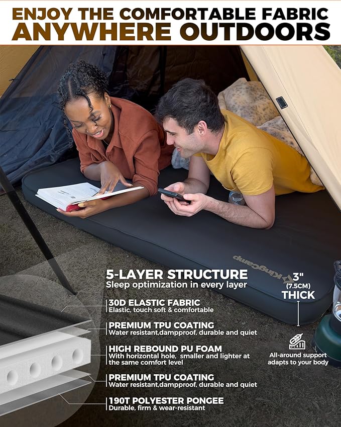 - 3" THICKNESS FOR ULTIMATE COMFORT ON ROUGH TERRAIN: The 3" thickness of this sleeping pad ensures you won’t feel sharp rocks or uneven ground beneath you. It provides superior cushioning, giving you a peaceful night’s sleep. Whether you're camping in a tent, on the ground, or in your truck, you’ll enjoy a soft, supportive surface that helps prevent discomfort from rugged terrain, ensuring a relaxing sleep no matter where you are.