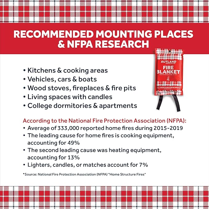 Rutland Fire Blanket for Home and Kitchen Emergency - 1 Pack, 40" x 40" - Fiberglass Fire Suppression Blanket Safety for Grilling, Camping and Boats (1)