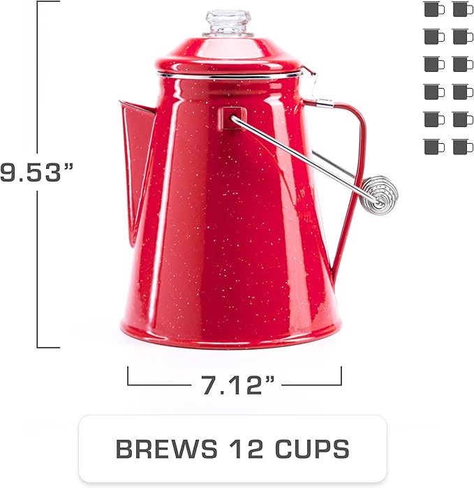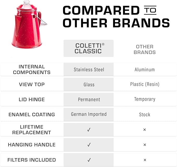- CAMPING COFFEE MADE EASY: A percolator coffee pot is simple, efficient, & classic. When you want something strong, and it’s too early for beer, brew with a COLETTI Classic (NOTE: 1 coffee cup equals 6 fl oz). Your Perfect Cowboy Coffee Pot