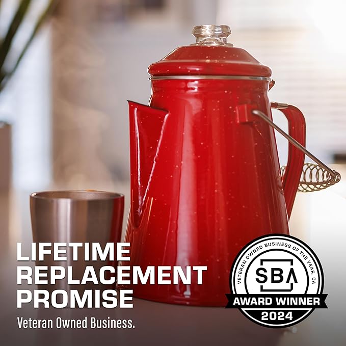 - LIFETIME REPLACEMENT PROMISE: Top materials & workmanship enable a superb promise. Shop with confidence. This is the last camping coffee pot you will ever need. US-based customer service provided by veterans