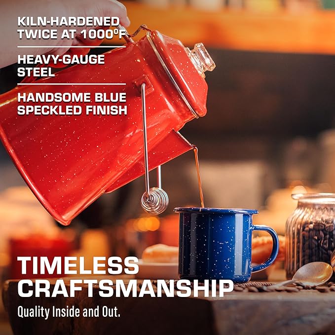 - TIMELESS CRAFTSMANSHIP: Built from heavy-gauge steel, every piece of this stovetop coffee maker is kiln-hardened twice at 1,000℉. A handsome blue camping coffee pot built to last