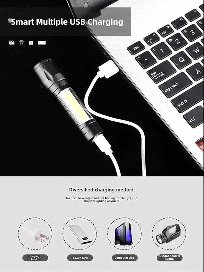 - EMERGENCY FLASHLIGHT -- This rechargeable flashlight can be used as an emergency energy source to charge some common USB devices, such as cell phones, headphones and so on. It is not only suitable for daily use such as camping, night dog walking, night running, night fishing, night riding, hiking, etc., but also for police night patrol, car maintenance and other workplaces such as gas stations, charging stations, chemical labs, airports, warehouses and so on.