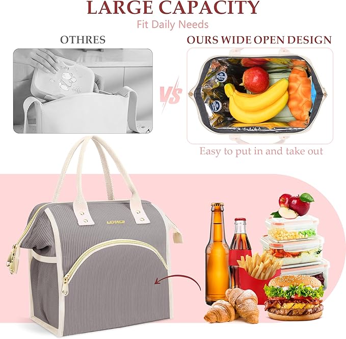 LOKASS Lunch Bag Women Insulated Lunch Box Wide-Open Lunch Tote Bag Large Cooler Bag for Work Picnic Hiking Beach(Dark Gray)