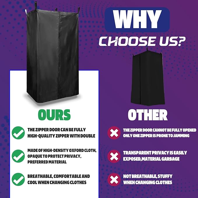 - Long Zipper Design: The inner layer of the changing room fabric adds shading fabric, and the double pull heavy-duty zipper makes the curtains easy to open or close, always keeping them vertical to prevent the tent from tipping over due to strong winds.