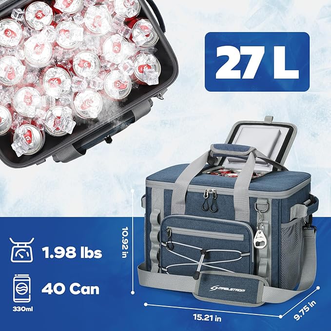 - Extra Large Capacity: The measure of Maelstrom 40 can soft cooler bag is 15.21*9.75*10.92 inch .This lunch cooler bag can easily hold 40 cans drinks of 330 ML (about 27L) to meet your storing needs.