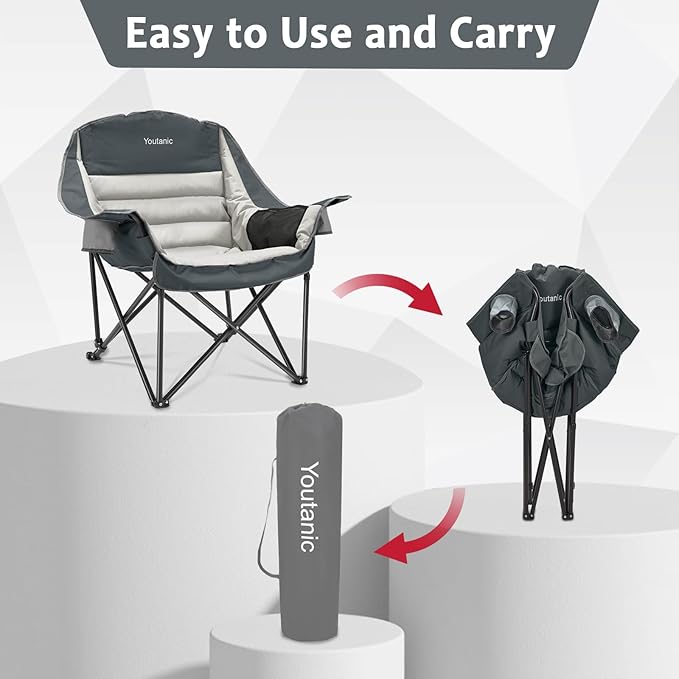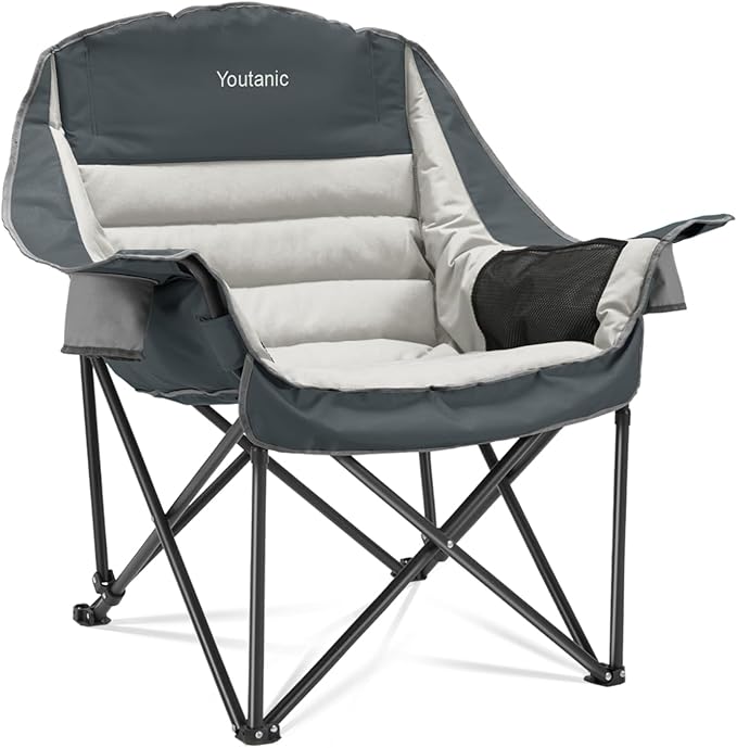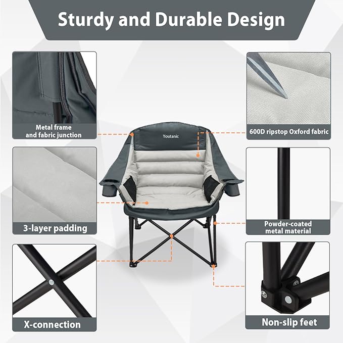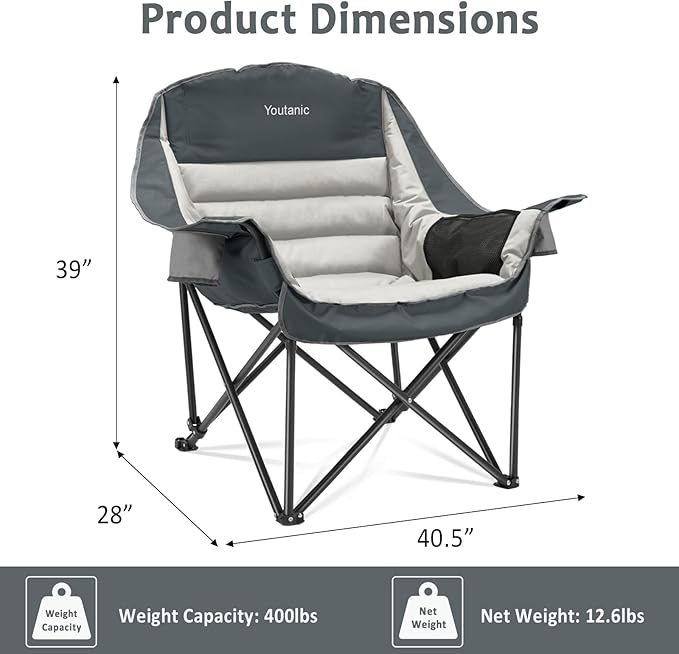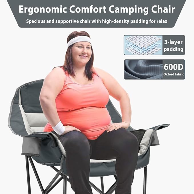- Extremely Comfortable: Our camping chairs for adults heavy duty, designed with ergonomic principles, feature spacious seats with unfolded dimensions of 40.5'' L x 28'' W x 39'' H. The Camping Folding Chair is filled with high-loft, high-density padding in areas such as the headrest, backrest, armrests, and seat cushion, providing ample space and support for your head, neck, back, waist, and hips. This ensures a comfortable experience even during prolonged sitting