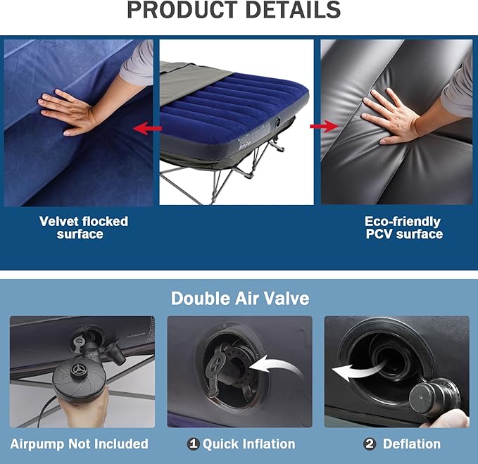 - Quick Setup: Easy to inflate and deflate,this twin size cot comes with a carrying bag for convenient storage and transport. Note: Air pump not included