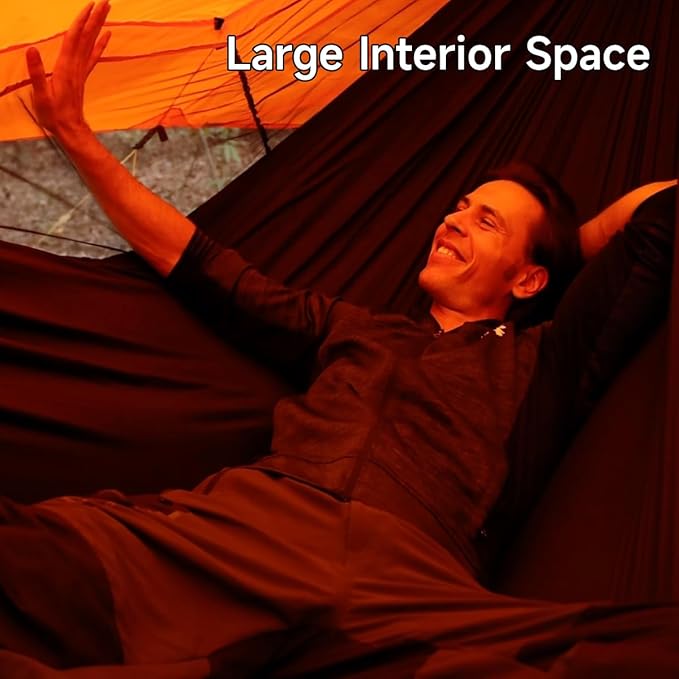 - 【Spacious Interior】The SkyNest hammock features a pentagonal internal design, with an outward-extending mosquito net that keeps it away from your face for maximum comfort. With a generous load capacity of up to 440 lbs, you’ll enjoy ample space without feeling confined, allowing you to stretch out freely and relax comfortably.