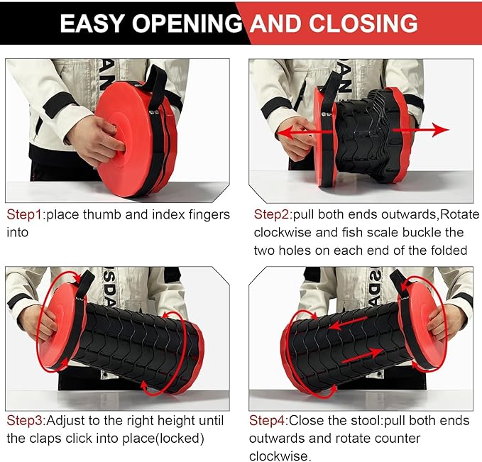 - 【Easy To Open And Use】The interior of this portable collapsible chair is designed with stiffeners to hold it in place, making the folding stool stronger and easier to open and close. The top and bottom of the collapsible stool are designed with two holes, you just need to hold the two holes, stretch and turn them clockwise/counterclockwise, and you can easily open and close the portable chairs for adults.