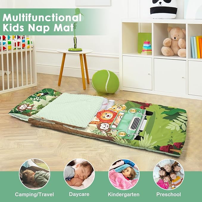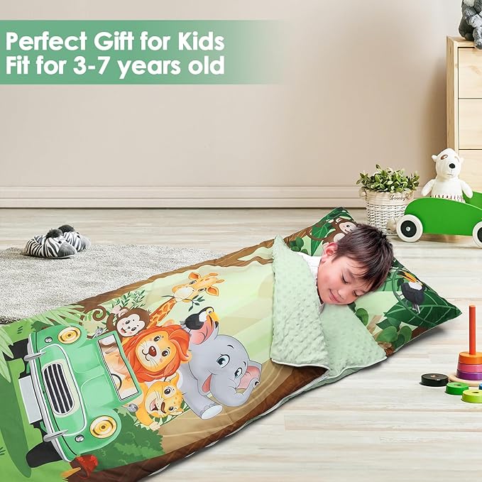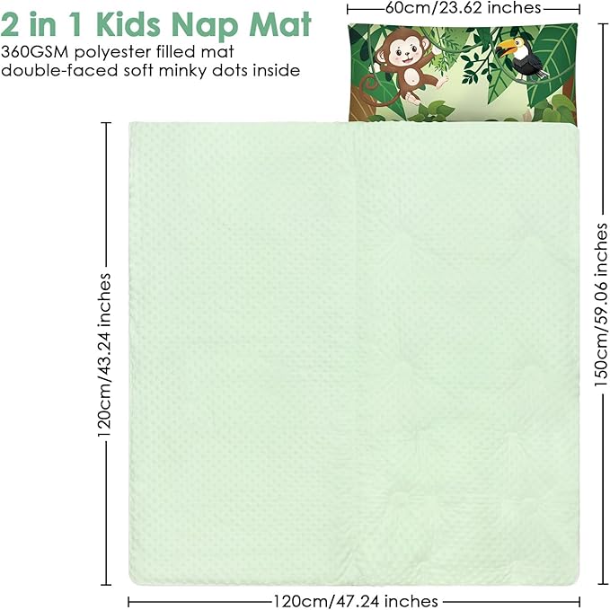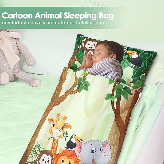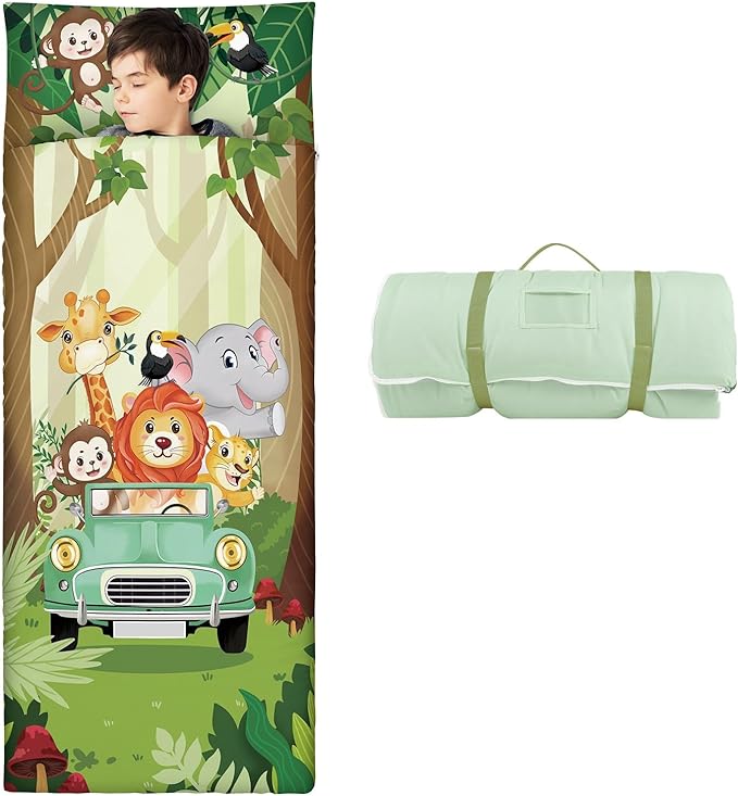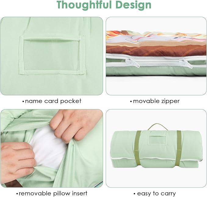 - Suitable Size and Thickness: Our child sleeping bag is 59 x 24 inches in full size; the mattress quilt is filled with 360gsm cotton and the cover is 80gsm.The pillow is 200g.Large size and thickened weight are very suitable for children's napping, bringing them an unforgettable sleeping experience.