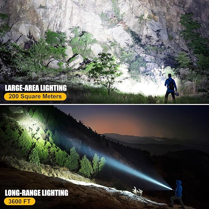- ADJUSTABLE FLASHLIGHT: Switch between wide beam and narrow beam by pulling and pushing the head of the flash light. Wide beam lighting, provides you with a bright and wide field of view when walking at night, dispels the darkness of 200 square meters for you, and narrow beam lighting is used for long-distance observation, with a maximum beam range of 3600 feet.
