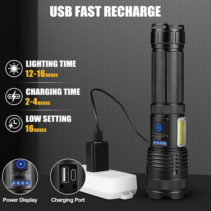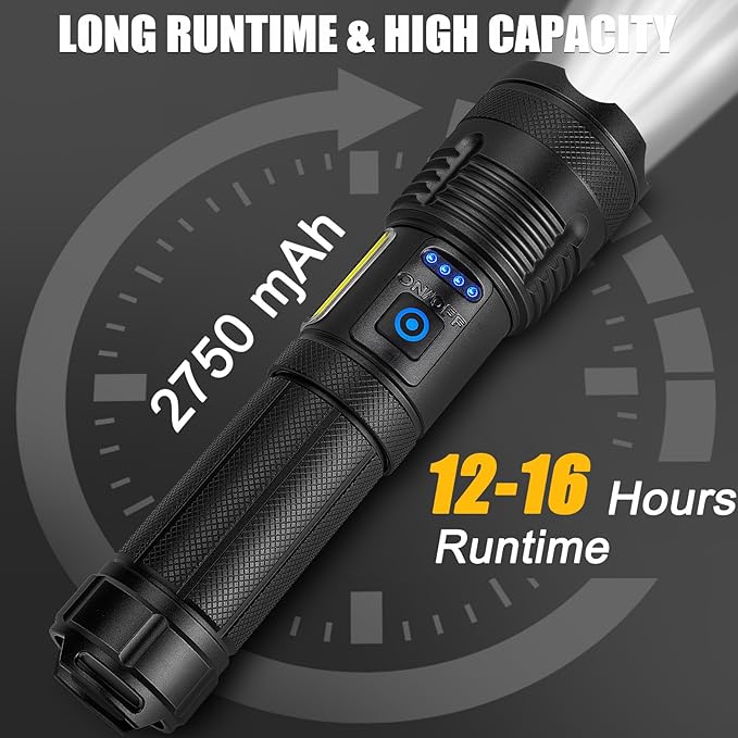 - 2H FAST CHARGING | 16H OF BRIGHTNESS: Rechargeable bright flashlight comes with premium rechargeable 2750 ɱAh ΒATTERY. Built-in tyρe C fast charging port for quick charging of the led flashlight. Experience up to 16 hours of brightness with just 2 hours of charging.