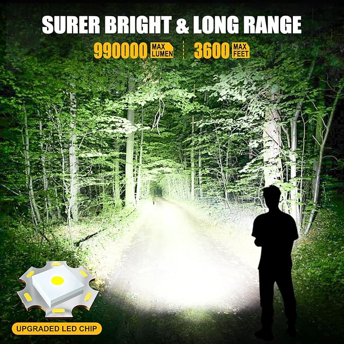 - 990000 LUMEN FLASHLIGHT: The NJ FOREVER rechargeable flashlights is a powerful handheld flashlight with 7 light modes. Using the latest chip technology, the led flashlight has a maximum illumination distance of up to 3600 feet and a maximum output of 990,000 lumens. Add brilliance to your adventures with this high-powered flashlight - light up your journey!