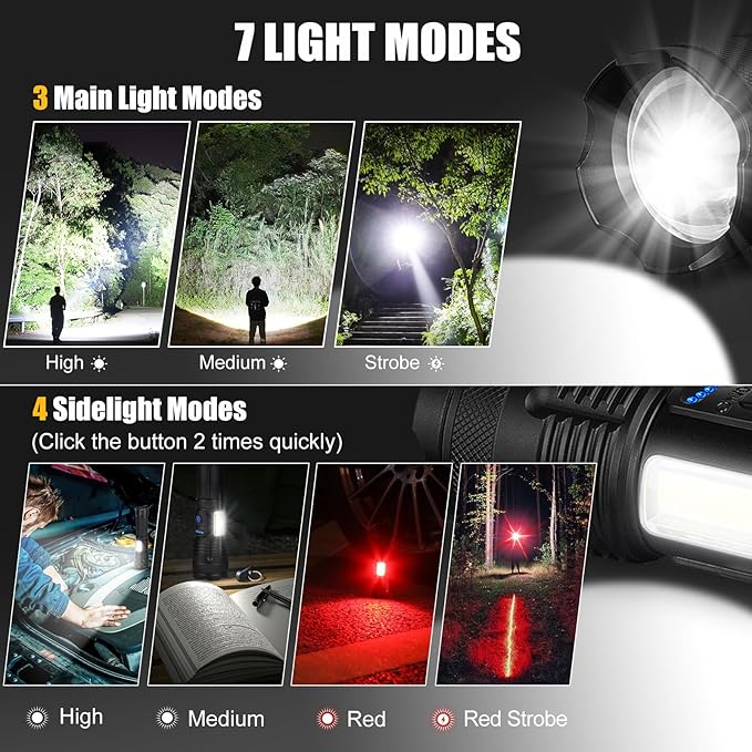 - 7 LIGHT MODES: The led flashlights high lumens has 3 main light modes: (High | Medium | Strobe) and 4 COB modes (High | Medium | Red | Red Strobe). Quickly press the switch button twice to switch to COB mode. Tip: Please charge before use.
