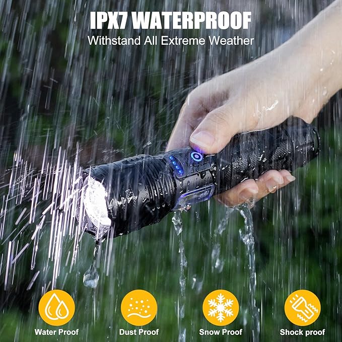 - IPX7 WATERPROOF & STURDY: Our waterproof flashlight uses advanced sealing technology to maintain IPX7 waterproofing, allowing you to brave hurricanes, storms, and any challenging weather conditions. Made of sturdy aluminum alloy, this flashlight rechargeable is rigorously tested to withstand accidental drops up to 25 feet and rough handling.