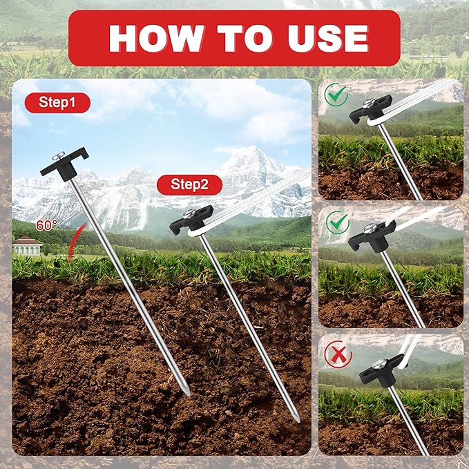 - Easy to Use: simply insert the tent stake through the T-shaped top hole, push it into the ground, and align with your tent straps; the additional included rope allows for secondary securing of your tent, providing added stability, ideal for camping and outdoor activities