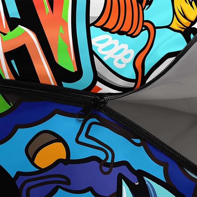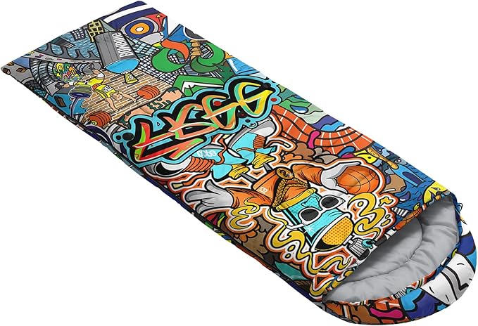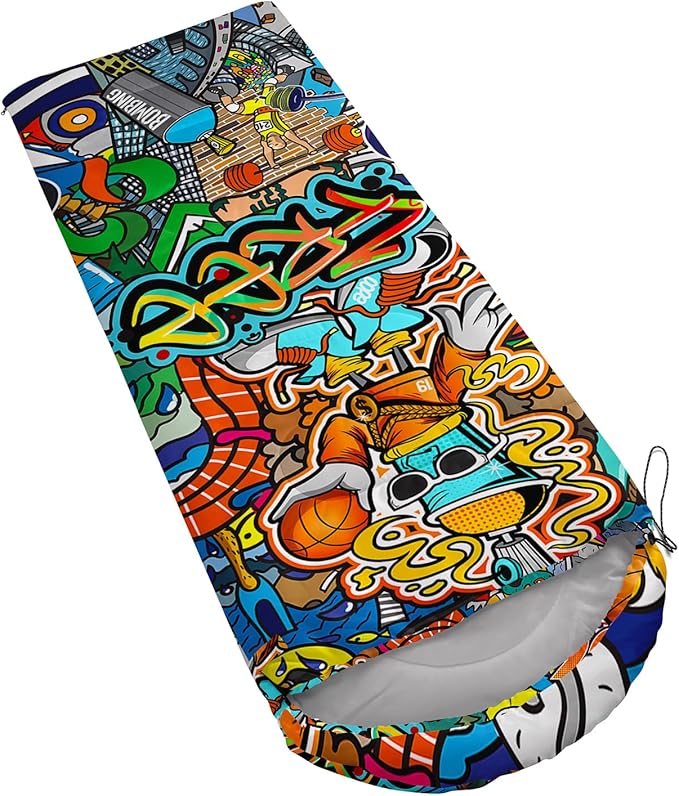 - Unique Hip Hop Design:This Hip Hop pattern sleeping bag is made of 3D digital printing with vibrant colors and patterns,size: 31W x 90L inches,temperature range: 32℉-77℉ (0℃-25℃),it also also have a weather resistant waterproof design to keep you warm and prevent you from any dampness,can be used in 3 seasons
