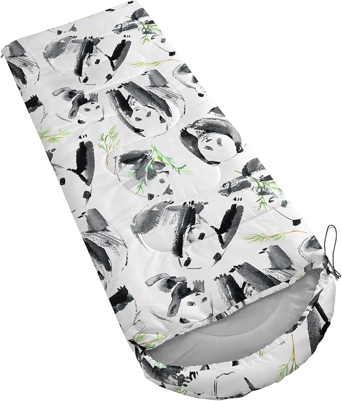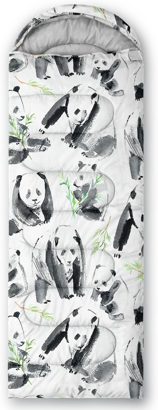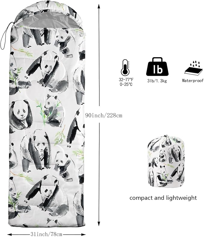 - Unique Panda Design:This Panda pattern sleeping bag is made of 3D digital printing with vibrant colors and patterns,size: 31W x 90L inches,temperature range: 32℉-77℉ (0℃-25℃),it also also have a weather resistant waterproof design to keep you warm and prevent you from any dampness,can be used in 3 seasons