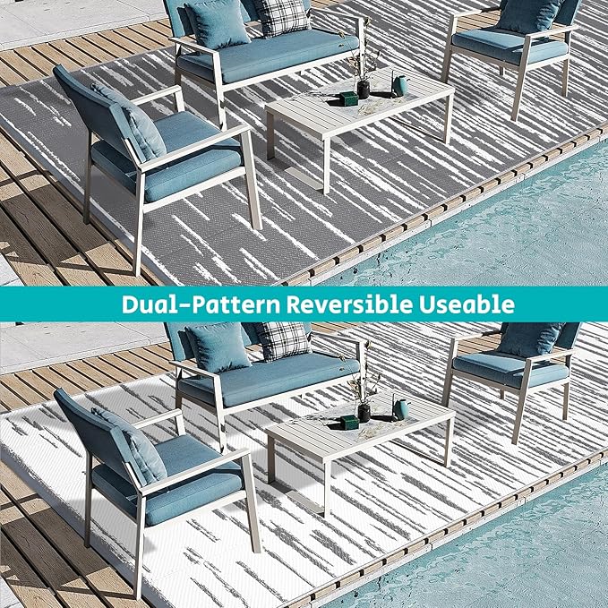- XXXXL Large Reversible Outdoor Rugs: Featuring a classic striped pattern on both sides, this rectangular 9x18 ft outdoor area rug allows you to instantly refresh your patio, porch, backyard, deck, RV campsite. And this outdoor deck rug is reversible, two-sided design allows you to have two different looks,both sides can blend perfectly with nature and look very full and comfortable.