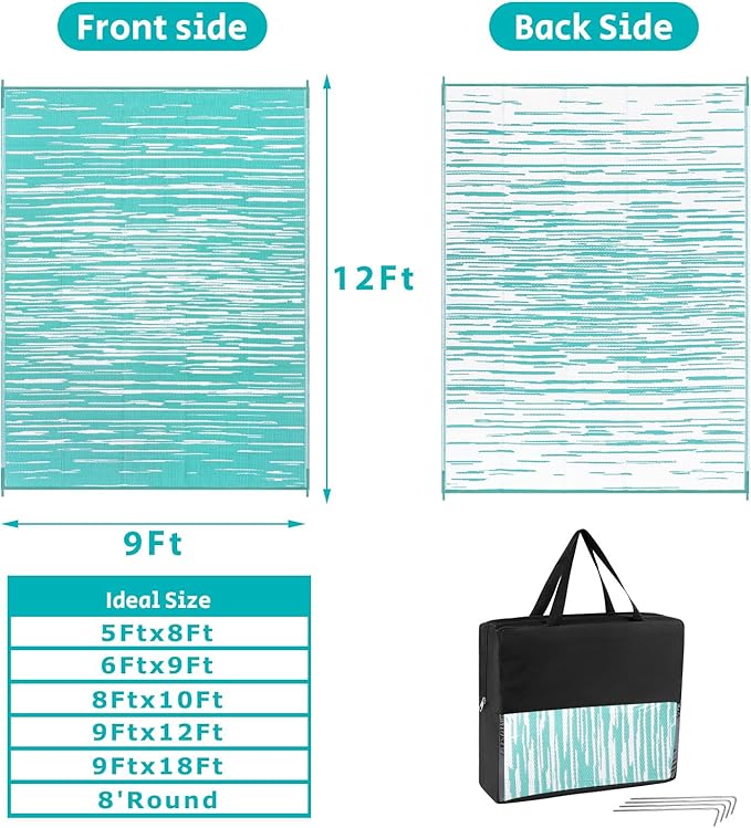 • Extra Large Reversible Outdoor RV Mats 9x12: The XXL large 9X12 ft outdoor porch rug with unique striped design, which makes it easy to use on patio,camper, deck, beach, backyard. And this outside camping rug is reversible, two-sided design allows you to have two different looks.