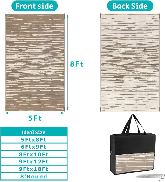 - Versatile Outdoor Carpet: The indoor outdoor plastic rugs have multiple choice in different colors(4'x6',5'x8',6'x9',8'x10',9'x12',9'x18',8'round), is ideal for a variety of indoor outdoor activities,like patio mat, deck rug, garden rug, beach mat, picnic mat, BBQ party mat, rv camping rug,pool rug,outdoor doormat,garage rug,front door mat,allowing you to have plenty of imaginable space for more fun.