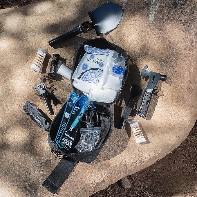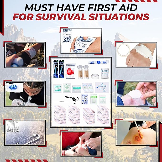- [Comprehensive First Aid Kit – Be Prepared] From minor cuts to more serious injuries, this fully stocked first aid kit includes wound dressings, burn treatments, bandages, instant ice packs, vinyl gloves, tweezers, cleaning pads, insect sting relief, and more. Designed for quick, effective response in the wilderness or at home.