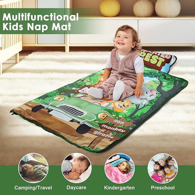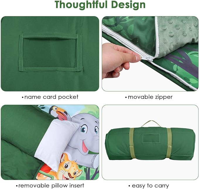 - 【User-Friendly Design】Our kids nap mat is a perfect portable choice for parents and children.The sleeping bag is furnished with Velcro straps and a handle, as well as a transparent name card pocket. Children can roll it up and lift it, easy to carry. It's practical for not only home but also daycare, preschool, nursery and outdoor activities.