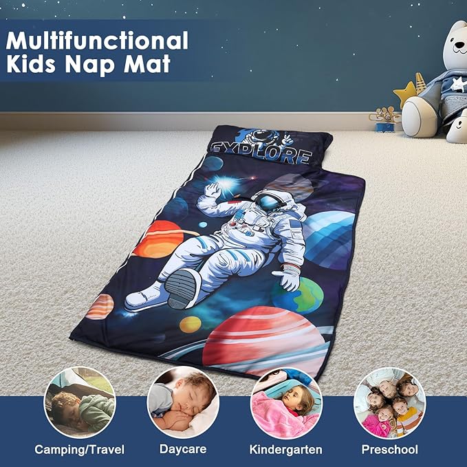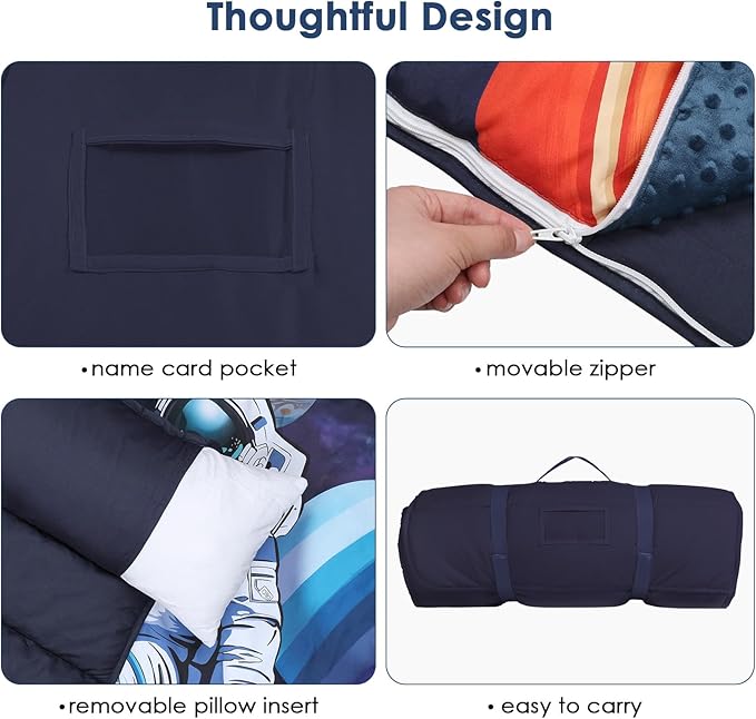 - 【User-Friendly Design】Our kids nap mat is a perfect portable choice for parents and children.The sleeping bag is furnished with Velcro straps and a handle, as well as a transparent name card pocket. Children can roll it up and lift it, easy to carry. It's practical for not only home but also daycare, preschool, nursery and outdoor activities.