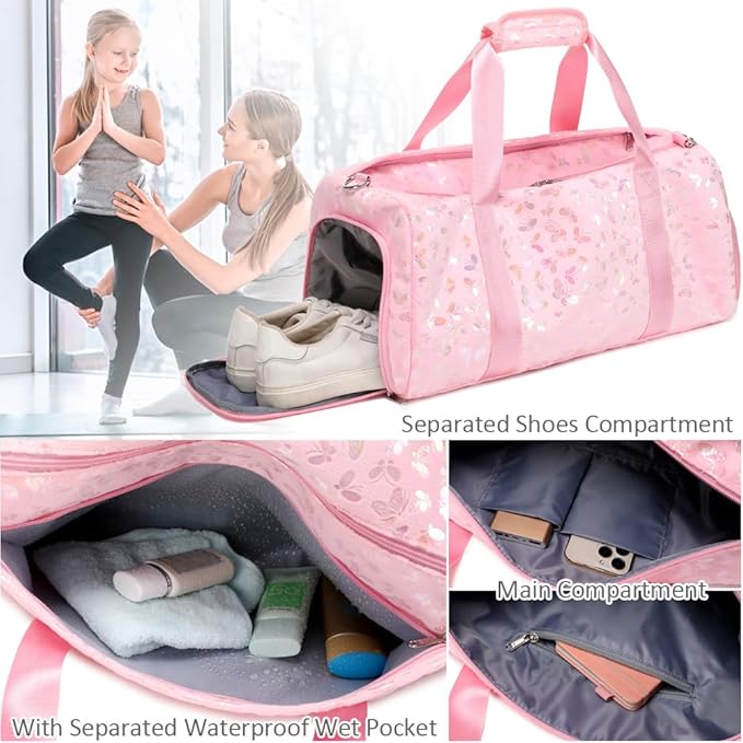 - Ideal Gift Duffle Bag for Girls - Cute shiny butterfly pattern,unique color, reinforced handheld, double smooth quality zipper. Could be used as carry-on weekender bag, cross body bag,travel bag, dance bag for girls. Perfect as birthday gift , Christmas Gift, New Year Gift for Girls.
