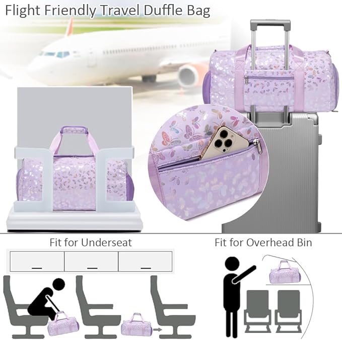 - Multifunctional Overnight Bag for Girls - Airplane friendly Girls Travel Duffel Bag with Trolley Sleeve - Back side sleeve allows you to slide the travel bag for Girls on the handle of a rolling suitcase or carry-on luggage, specially as a personal item bag to carry on the plane. Perfect size to fit under the seat on the airplane.