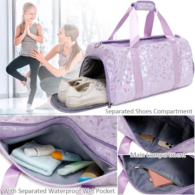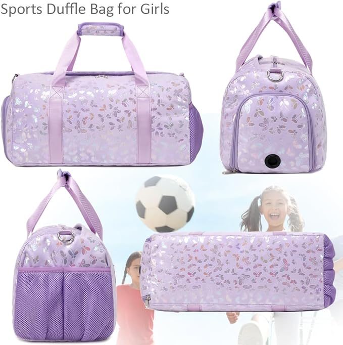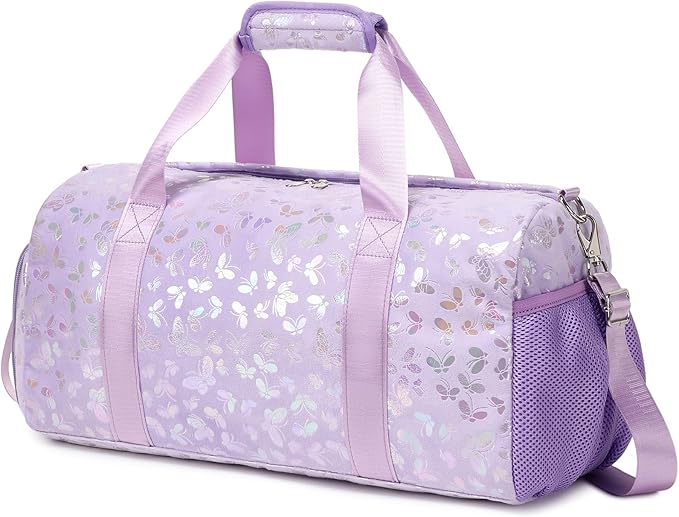 - Ideal Gift Duffle Bag for Girls - Cute shiny butterfly pattern,unique color, reinforced handheld, double smooth quality zipper. Could be used as carry-on weekender bag, cross body bag,travel bag, dance bag for girls. Perfect as birthday gift , Christmas Gift, New Year Gift for Girls.