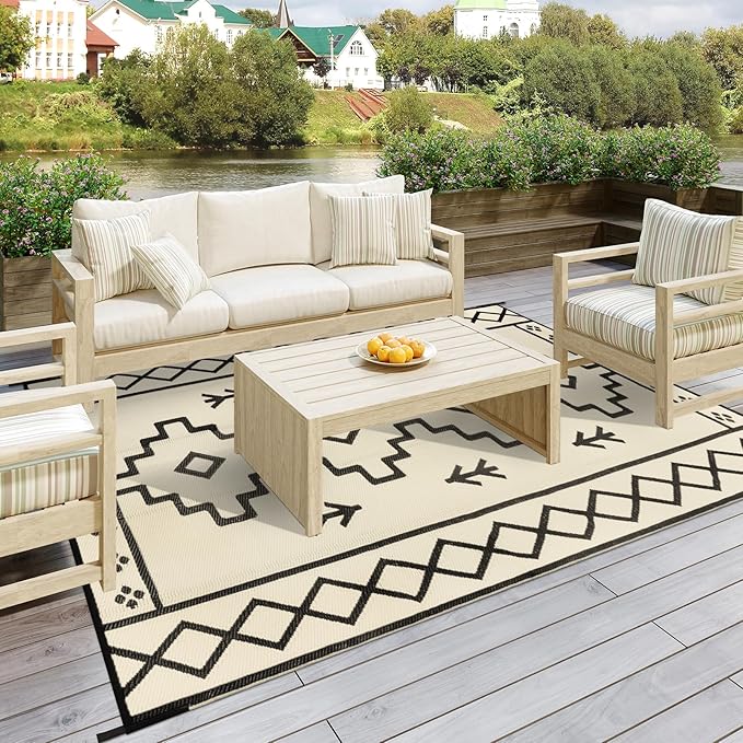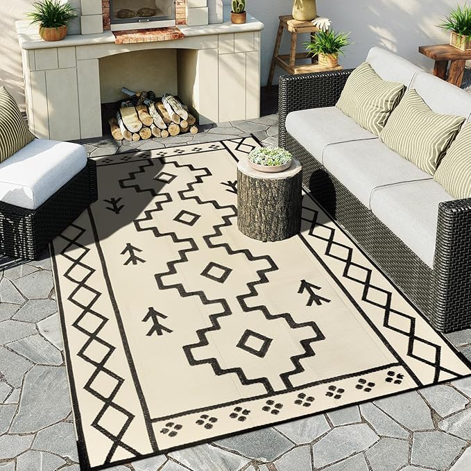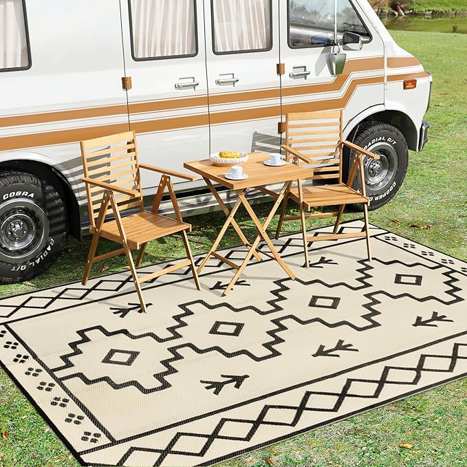 - Reversible and Versatile: This outdoor camping rug is designed with two-sided geometric patterns, if one side is messed up, just flip over to get a new one. It can be widely used in porch, patio, balcony, RV, deck, backyard, camper, balcony, picnic, tent