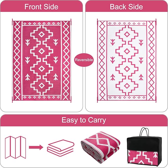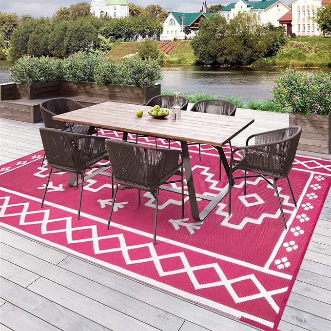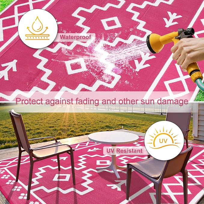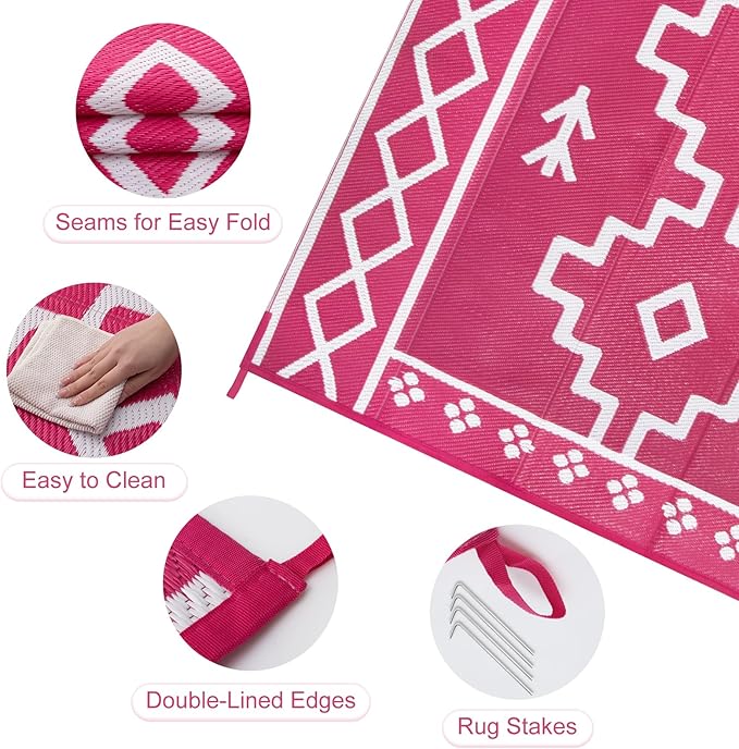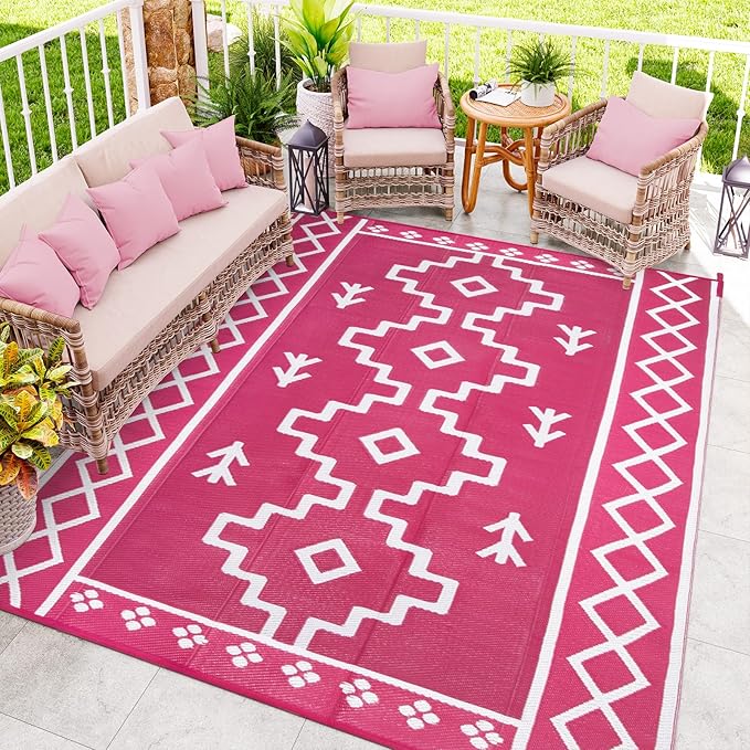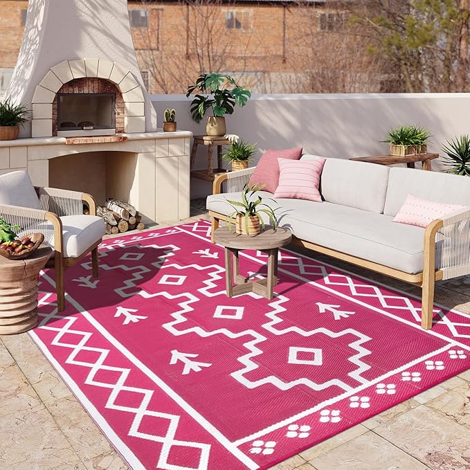 Uphome Outdoor Rugs 8x10 Waterproof, Reversible Hot Pink Boho RV Camping Rug, Patio Plastic Straw Outside Rug, Large Foldable Outdoor Mat Carpet for Backyard Deck Pool Balcony Picnic Beach, 8'x10'