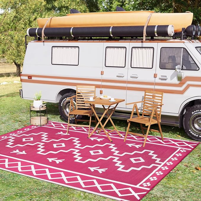 - Reversible and Versatile: This outdoor camping rug is designed with two-sided geometric patterns, if one side is messed up, just flip over to get a new one. It can be widely used in porch, patio, balcony, RV, deck, backyard, camper, balcony, picnic, tent