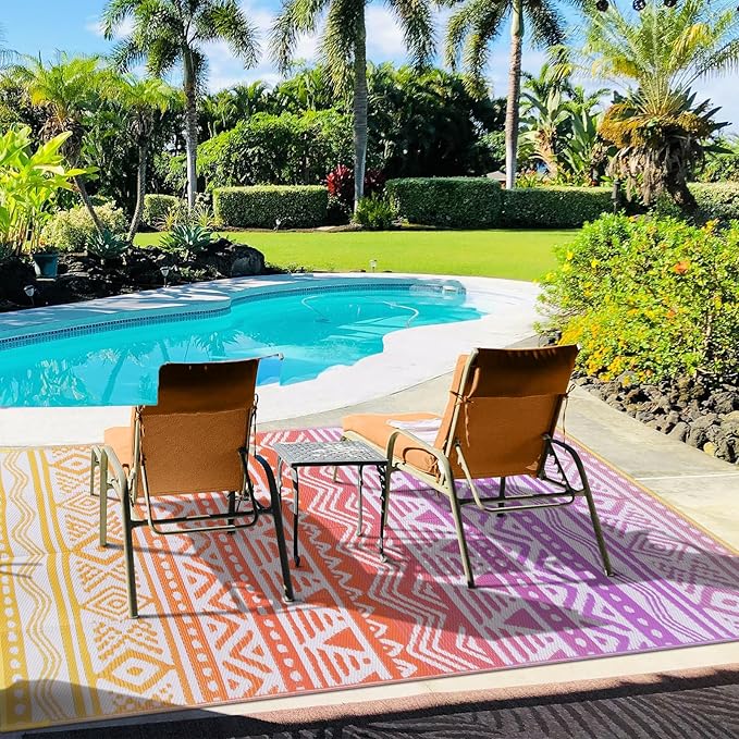 - REVERSIBLE AND VERSATILE: This plastic outdoor rug features universal colors and a reversible design, making it easy to refresh your outdoor space with just a quick flip. Suitable for use in any space or occasion, such as balcony, patio, porch, backyard, deck, beach, picnic, RV camping, etc.