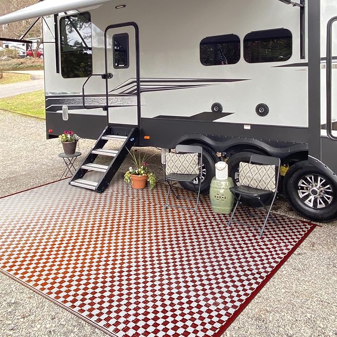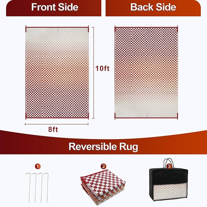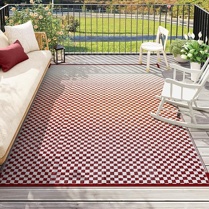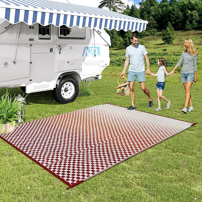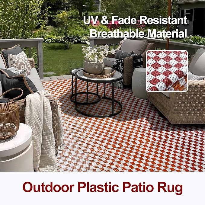 - [Versatile Outdoor Rug] The large outdoor rug is woven from a breathable, comfortable plastic material that won't damage your deck or lawn. Ideal for patio, deck, garden, backyard, balcony, camping, picnics, tent, RV road trips, beach and indoor rooms