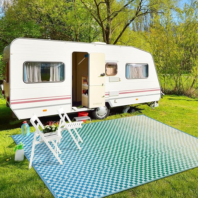 - [Versatile Outdoor Rug] The large outdoor rug is woven from a breathable, comfortable plastic material that won't damage your deck or lawn. Ideal for patio, deck, garden, backyard, balcony, camping, picnics, tent, RV road trips, beach and indoor rooms